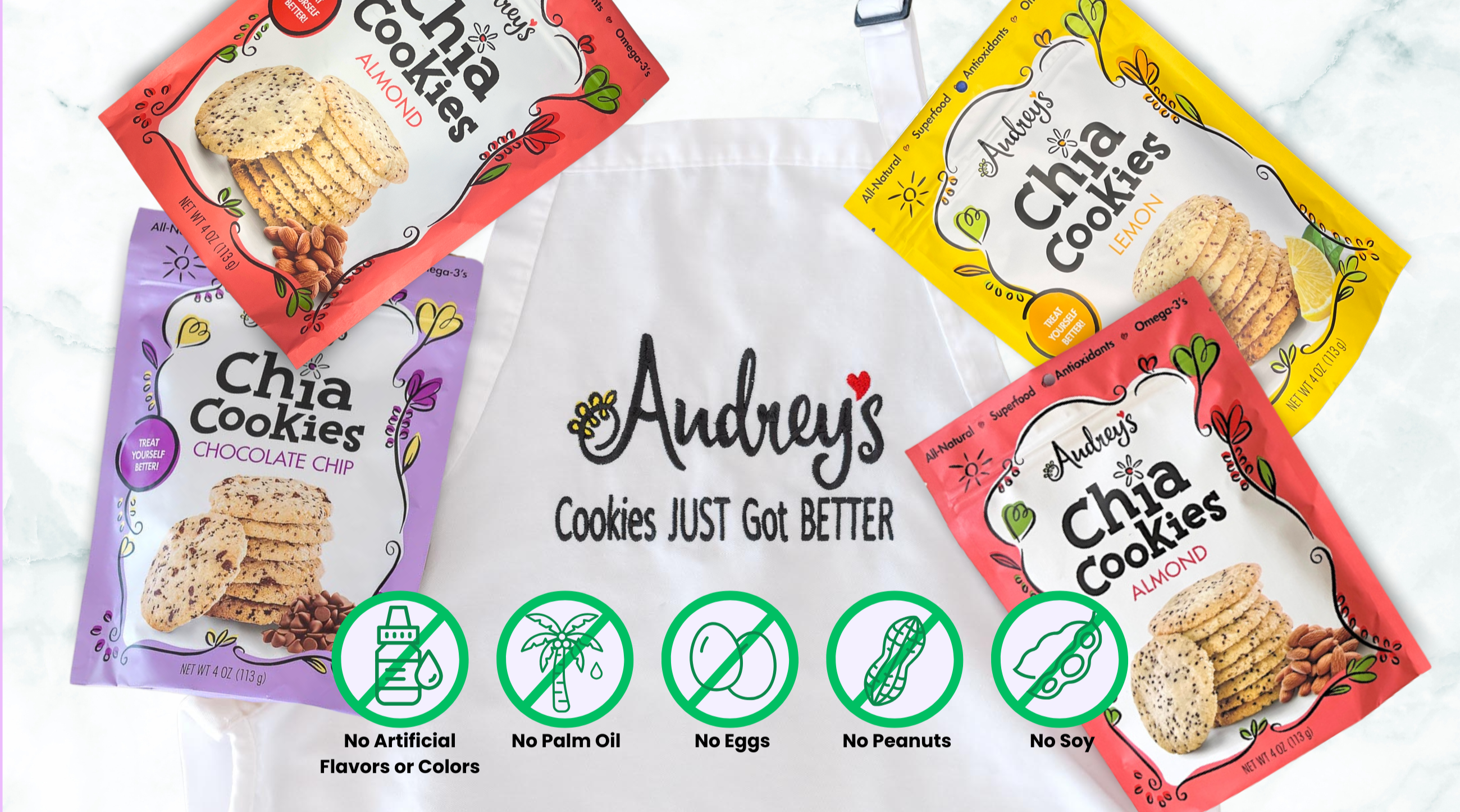 Audrey's better-for-you cookies are made with premium quality ingredients and packed with chia seeds. These great tasting, crunchy cookies will satisfy your craving while providing the benefits of chia.
