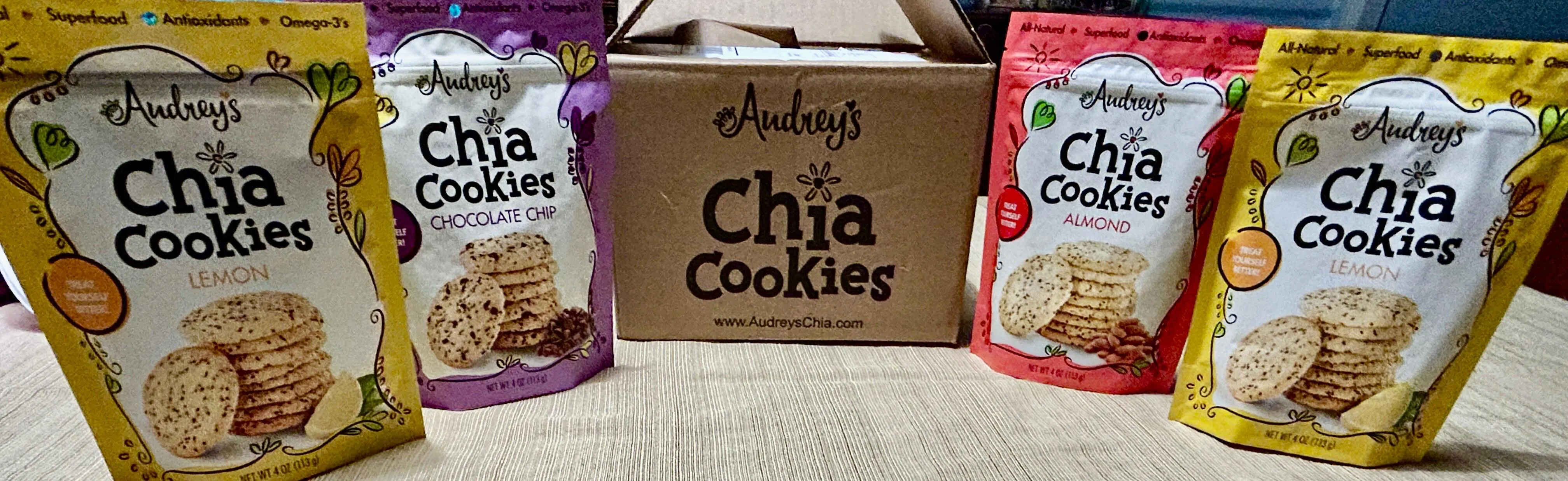 Audrey's Chia Cookies are all-natural, non-GMO, and designed to be a “Better-For-You” treat that combines delicious flavor with the functional power of chia seeds. They fuel your body while satisfying your cravings for a sweet indulgence. Unlike traditional cookies, Audrey's Chia Cookies are packed with superfood chia seeds, delivering extra nourishment and health benefits such as: