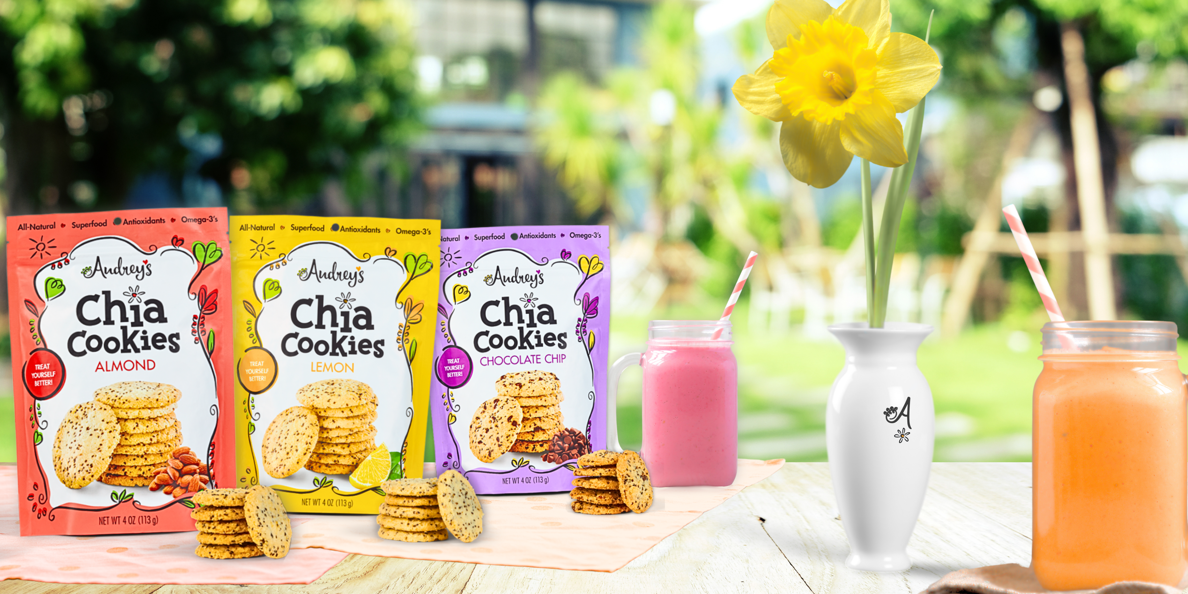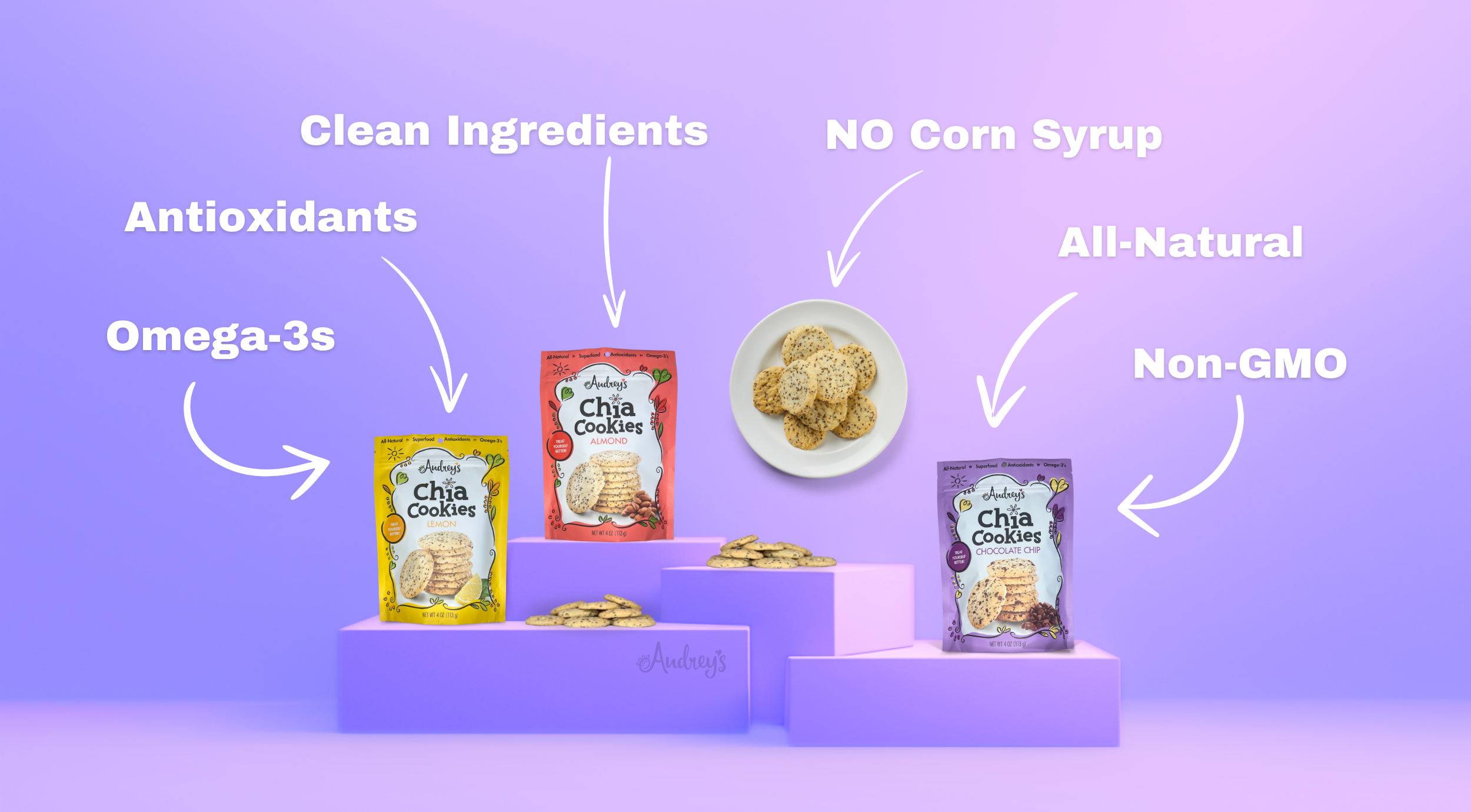 Audrey's Chia Cookies are all-natural, non-GMO, and designed to be a “Better-For-You” treat that combines delicious flavor with the functional power of chia seeds. They fuel your body while satisfying your cravings for a sweet indulgence. Unlike traditional cookies, Audrey's Chia Cookies are packed with superfood chia seeds, delivering extra nourishment and health benefits such as: